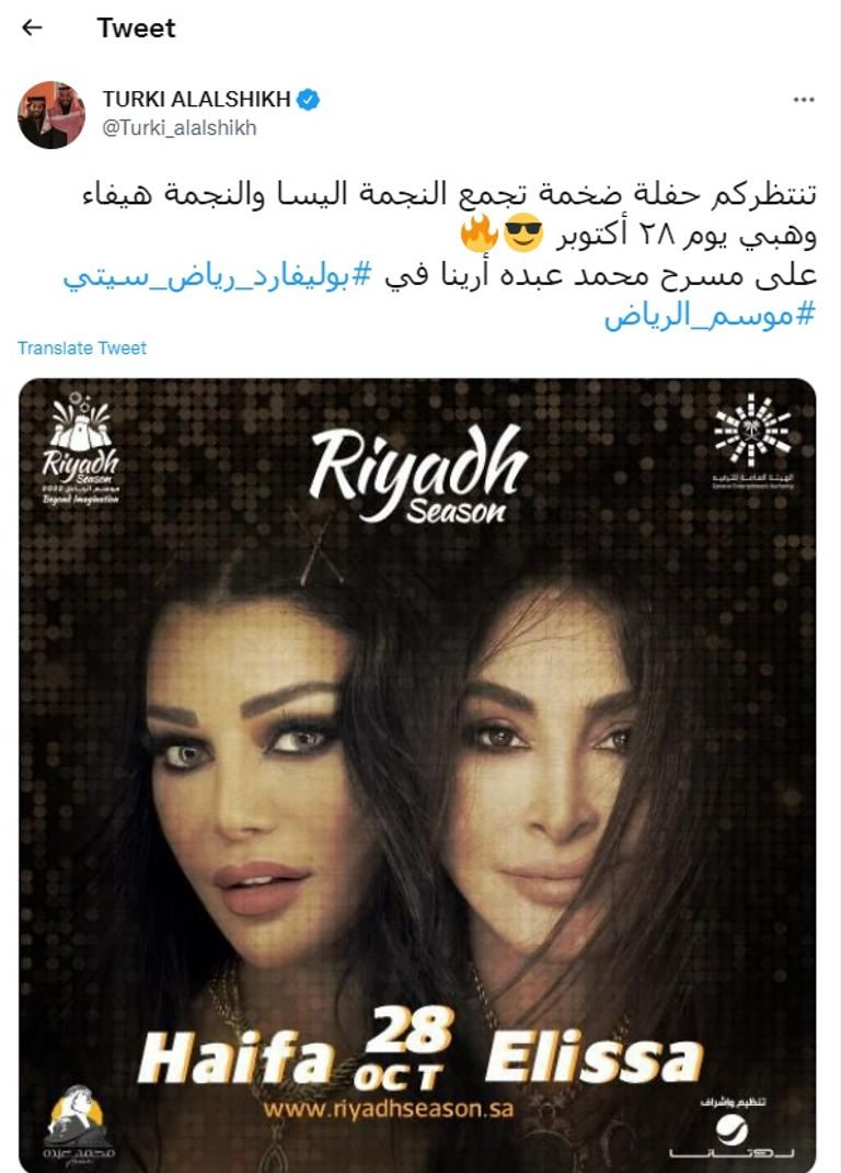 أعلن المستشار تركي آل الشيخ، رئيس الهيئة العامة للترفيه بالمملكة العربية السعودية، عن حفل ضخم يجمع بين النجمتين إليسا وهيفاء وهبي، في الـ28 من أكتوبر الجاري.