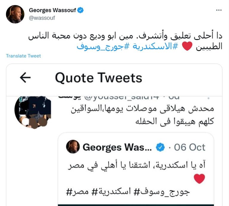 وكان النجم السوري قد وجه رسالة إلى جمهوره في مصر عبر صفحته بموقع التواصل الاجتماعي "فيسبوك" قائلا: "آه يا إسكندرية، اشتقنا يا أهلي في مصر".
