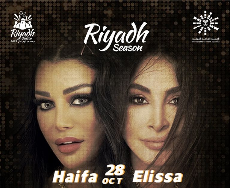 نشرت الفنانة اللبنانية هيفاء وهبي عبر حسابها بموقع تويتر، الملصق الترويجي لحفلها المشترك مع النجمة إليسا، ضمن فعاليات موسم الرياض 2022، في 28 أكتوبر/تشرين الأول.