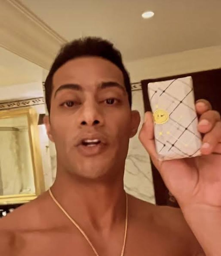 ونشر محمد رمضان الفيديو وهو يفتح الهدية، ويقول: "النهاردة جاتلى هدية غريبة جدًا، أغلى صابونة في العالم دهب عيار 24، عشان أغسل بيها وشي".
