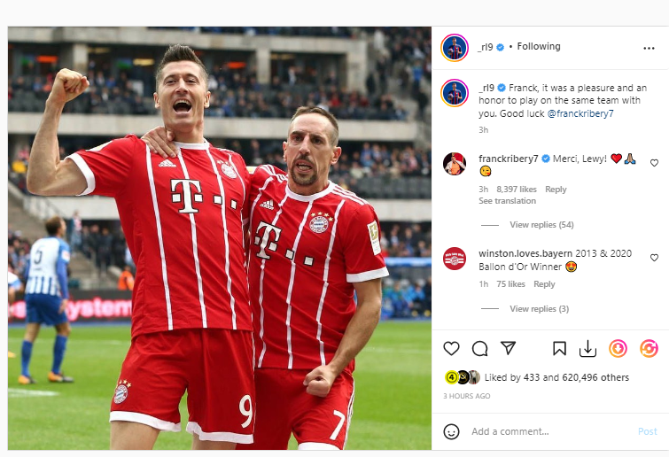 حيث نشر ليفاندوفسكي، عبر حسابه على إنستجرام، صورة لهما معا أثناء اللعب بنادى بايرن ميونخ، وعلق قائلا، "فرانك لقد كان من دواعى سروري وشرفا لى أن ألعب معك بنفس الفريق حظا سعيدا".