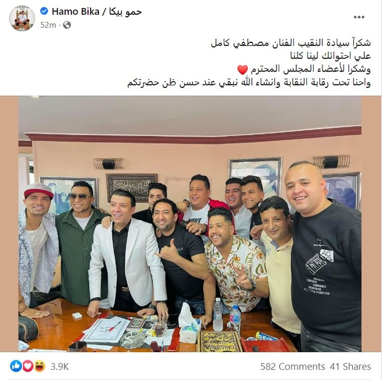 وعلق حمو بيكا على الصورة بقوله: "شكرًا سيادة النقيب الفنان مصطفى كامل على احتوائك لنا جميعًا، وشكرًا لأعضاء المجلس المحترم. نحن تحت رقابة النقابة وإن شاء الله نكون عند حسن ظن حضراتكم".
