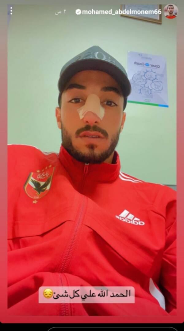 كما نشر محمد عبد المنعم صورة عبر ستوري بـ “انستجرام” وهو يضع لاصق طبي على أنفه وعلق عليها: الحمد لله على كل شئ.