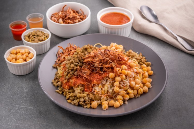 - وأخيرا اغرفي الكشري في اطباق التقديم وزينيه بالبصل المقرمش والحمص المسلوق بجانب أطباق الصلصة ودقة عصير الليمون.