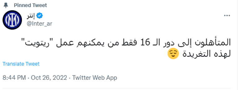 ومن جانبه، نشر الحساب الرسمي لنادي الإنتر في نسخته العربية تغريدة قال خلالها: "المتأهلون إلى دور الـ 16 فقط من يمكنهم عمل "ريتويت" لهذه التغريدة".