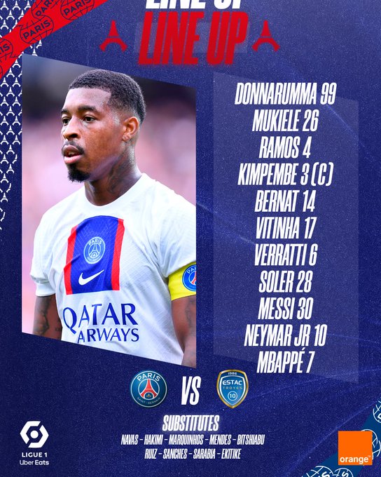أعلن كريستوفر جاليتيه لفريق باريس سان جيرمان تشكيل فريقه استعدادا لمواجهة فريق تروا، ضمن منافسات الجولة الـ 13 من مسابقة الدوري الفرنسي موسم 2022-2023 في تمام الساعة الخامسة مساء اليوم.