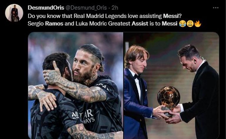 ونشر أحد مستخدمي موقع التواصل الاجتماعي "تويتر" تغريدة ساخرة قال فيها إن "أساطير ريال مدريد يواصلون تقديم التمريرات الحاسمة لميسي"، وأرفقها بصورة لوكا مودريتش، نجم الفريق الملكي، وهو يسلم جائزة الكرة الذهبية للنجم الأرجنتيني عام 2019.
