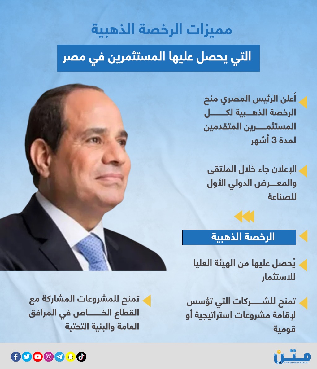 أعلن الرئيس المصري منح الرخصة الذهبية لكل المستثمرين المتقدمين لمدة 3 أشهر