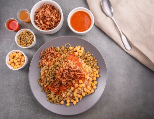 - وأخيرا ضعي طبقات الكشري فوق بعضها داخل أطباق التقديم وزينيه بالبصل المقرمش.