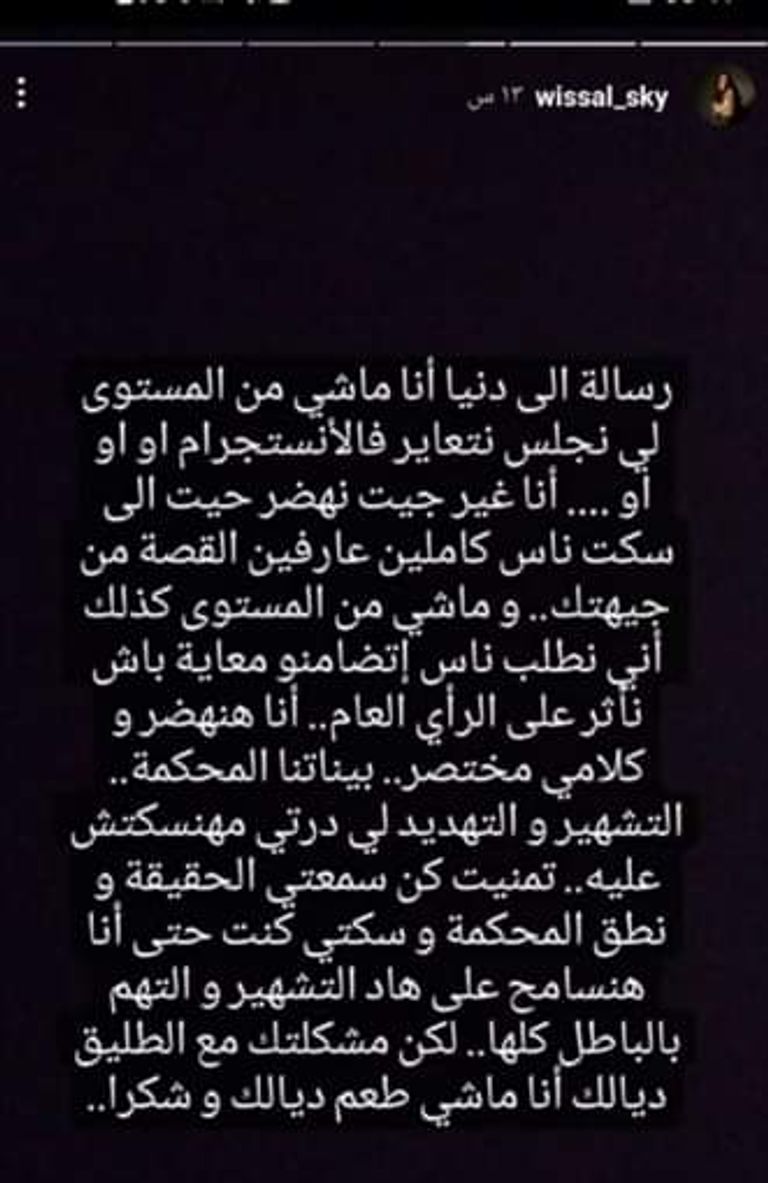وختمت الشابة المغربية رسائلها إلى دنيا بطمة، قائلة: "مشكلتك مع طليقك (محمد الترك)، وأنا لست طعمًا لكِ".