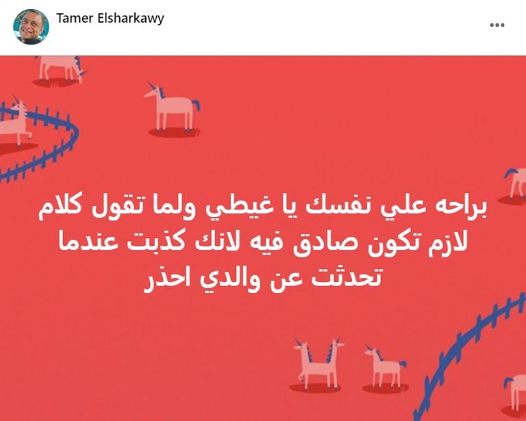 وكتب "تامر" منشورًا عبر "فيسبوك"، قال خلالها إلى "الغيطي" ما يلي: "بالراحة على نفسك يا غيطي. لما تقول كلام لازم تكون صادق فيه لإنك كذبت عندما تحدثت عن والدي.. احذر".