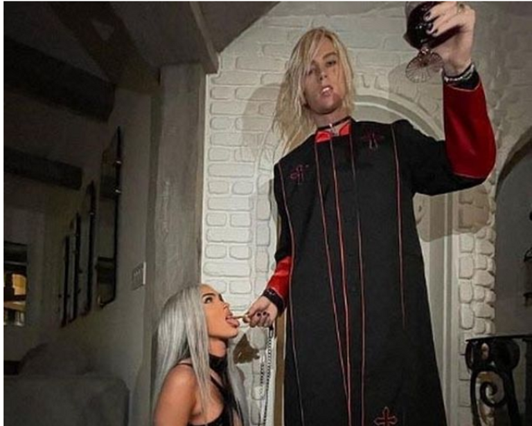 وأقرنت ميجان الإطلالة برداء أسود يغطي ملابسها المكشوفة، وعقد مربوط على عنقها، وأكملت الإطلالة بباروكة شعر باللون البلاتيني"، بينما ارتدى زوجها المغني ماشين جان كيلي ثوب رهبان كاثوليك.