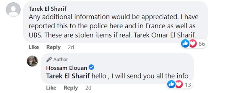 وقال الابن في تعليقه، موجهًا حديثه للكاتب: "سيكون موضع تقدير منحي أي معلومات إضافية. لقد أبلغت الشرطة هنا وفي فرنسا. هذه أشياء مسروقة إذا كانت حقيقية".