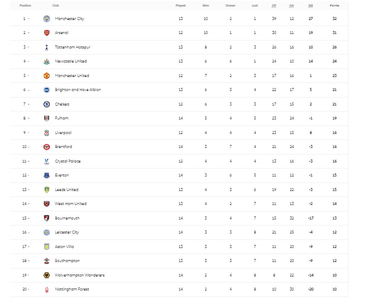 ويتواجد فريق توتنهام هوتسبير فى المركز الثالث برصيد 26 نقطة، يليه نيوكاسل يونايتد رابعا فى الترتيب برصيد 24 نقطة، وحل مانشستر يونايتد فى المركز الخامس برصيد 23 نقطة، ثم برايتون برصيد 21 نقطة، بعد فوزه على وولفرهامبتون بنتيجة 3 - 2.