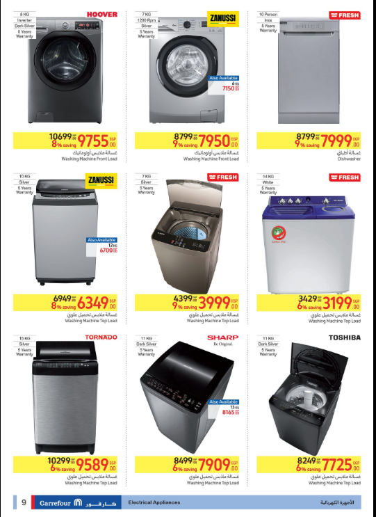 - غسالة ملابس اوتوماتيك نوع هوفر 8 كيلو بضمان خمس سنوات سعرها في كارفور 9755 جنيه مصري بدلا من 10699.