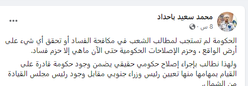 وقال باحداد في تغريدة على حسابه بموقع تويتر اليوم الثلاثاء إن: "لهذا نطالب بإجراء إصلاح حكومي حقيقي يضمن وجود حكومة قادرة على القيام بمهامها منها تعيين رئيس وزراء جنوبي مقابل وجود رئيس مجلس القيادة من الشمال.