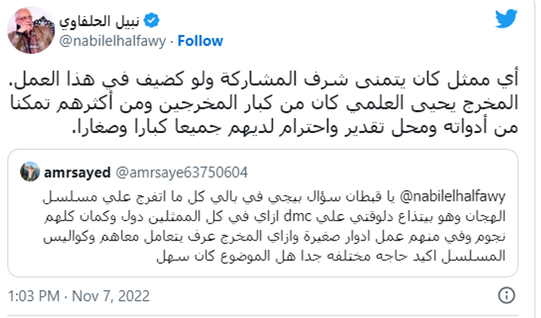 حديث الحلفاوي جاء ردا على سؤال من أحد متابعيه على موقع التغريدات، تويتر، قال فيه "يا قبطان سؤال بييجي في بالي كل ما اتفرج على مسلسل الهجان، إزاي فيه كل الممثلين دول وكلهم نجوم، وفي منهم عمل أدوار صغيرة، وإزاي المخرج عرف يتعامل معاهم، وكواليس المسلسل أكيد حاجة مختلفة جدا، هل الموضوع كان سهل؟".