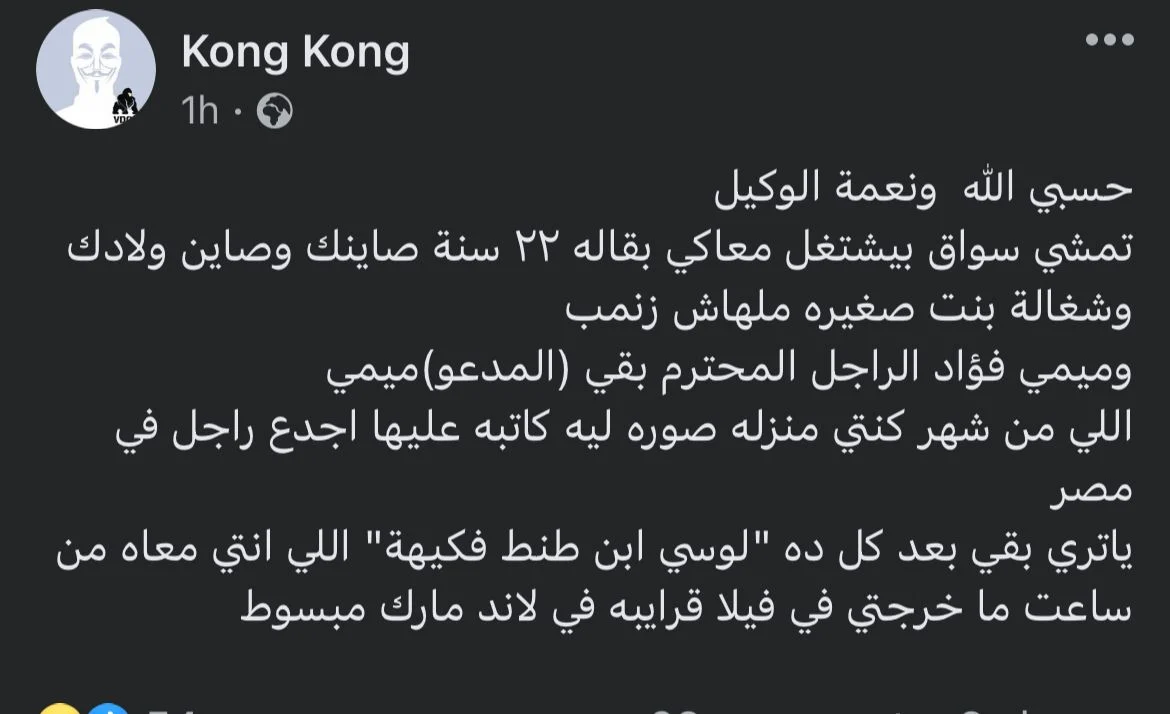كما كتب محمد عبد الوهاب، منشورًا عبر حسابه الشخصي بموقع التواصل الاجتماعي فيسبوك، وقال: حسبي الله ونعمة الوكيل.. تمشي سواق بيشتغل معاكي بقاله 22 سنة صاينك وصاين ولادك وشغالة بنت صغيره ملهاش زنب.. وميمي فؤاد الراجل المحترم بقى اللي من شهر كنتي منزله صورة ليه كاتبة عليها.. أجدع راجل في مصر.