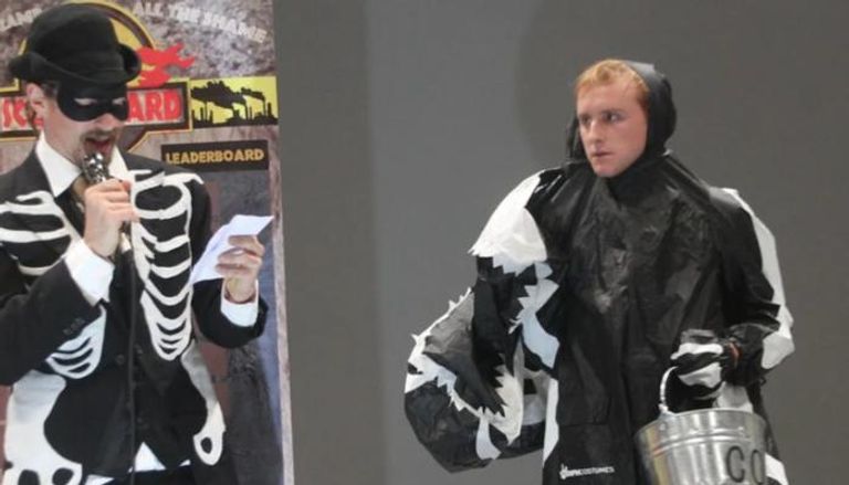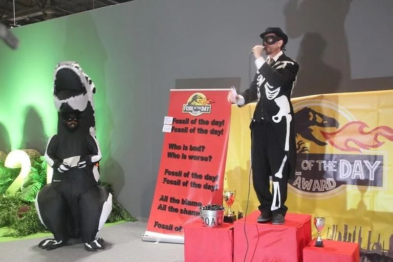 بينما يرتدي العضو الآخر بدلة لديناصور، لتحذير البشر من أن يكون مصيرهم مثل الديناصورات التي انقرضت بعد معاناتها من التغيرات التي حدثت على كوكب الأرض.