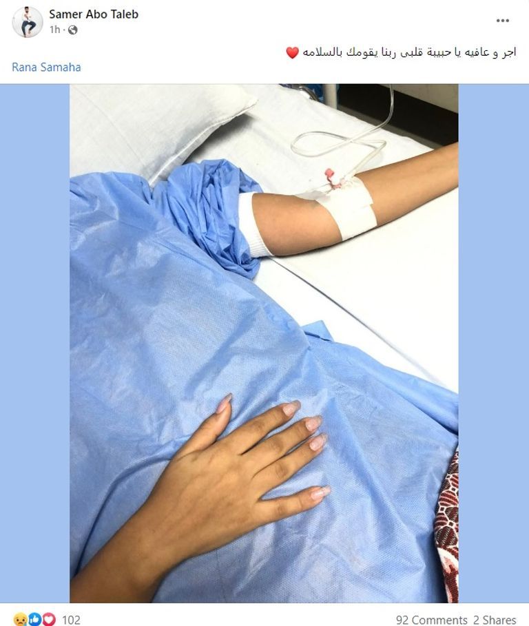 حيث نشر الملحن سامر أبوطالب، زوج الفنانة رنا سماحة، صورة لـ "رنا" من داخل المستشفى عبر حسابه على "فيسبوك"، وطالب جمهورها بالدعاء لها.