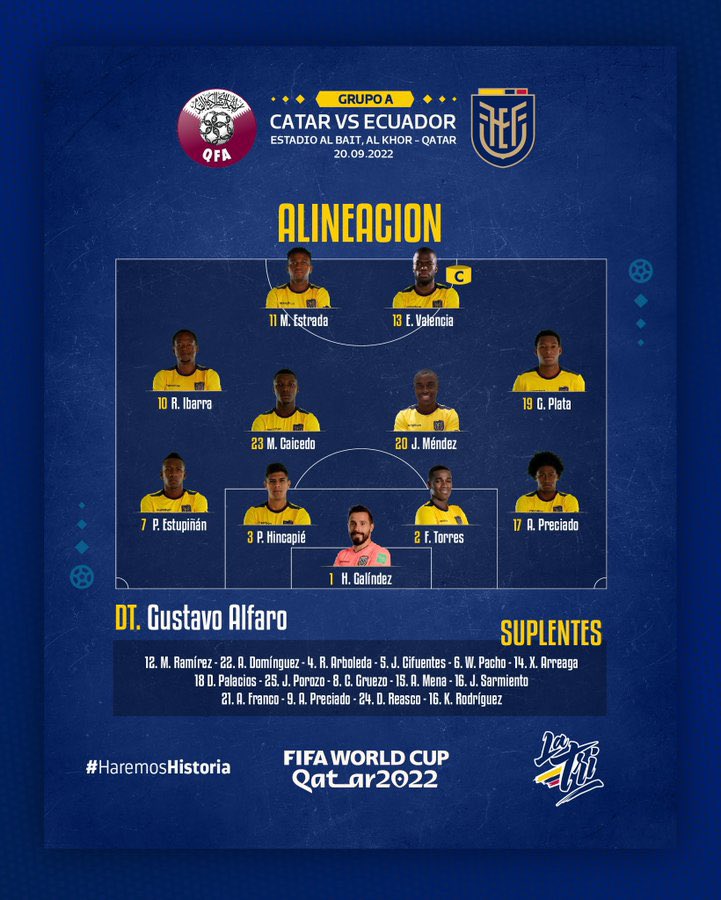 أعلن الإسبانى فيليكس سانشيز، المدير الفني لمنتخب قطر، والأرجنتيني جوستافو الفارو مدرب الأوكوادور، التشكيل الأساسي الذى يخوض المواجهة الافتتاحية في كأس العالم 2022، والمقرر إقامتها في الساعة السابعة مساء اليوم، الأحد، بتوقيت الدوحة، على ستاد "البيت" بمدينة الخور.