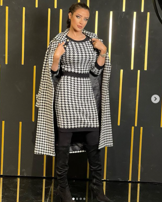 وظهرت بإطلالة مثيرة كشفت عن انوثتها وجمالها الطبيعى مرتدية ملابس شتوية كوت منقط اسود مع الابيض.