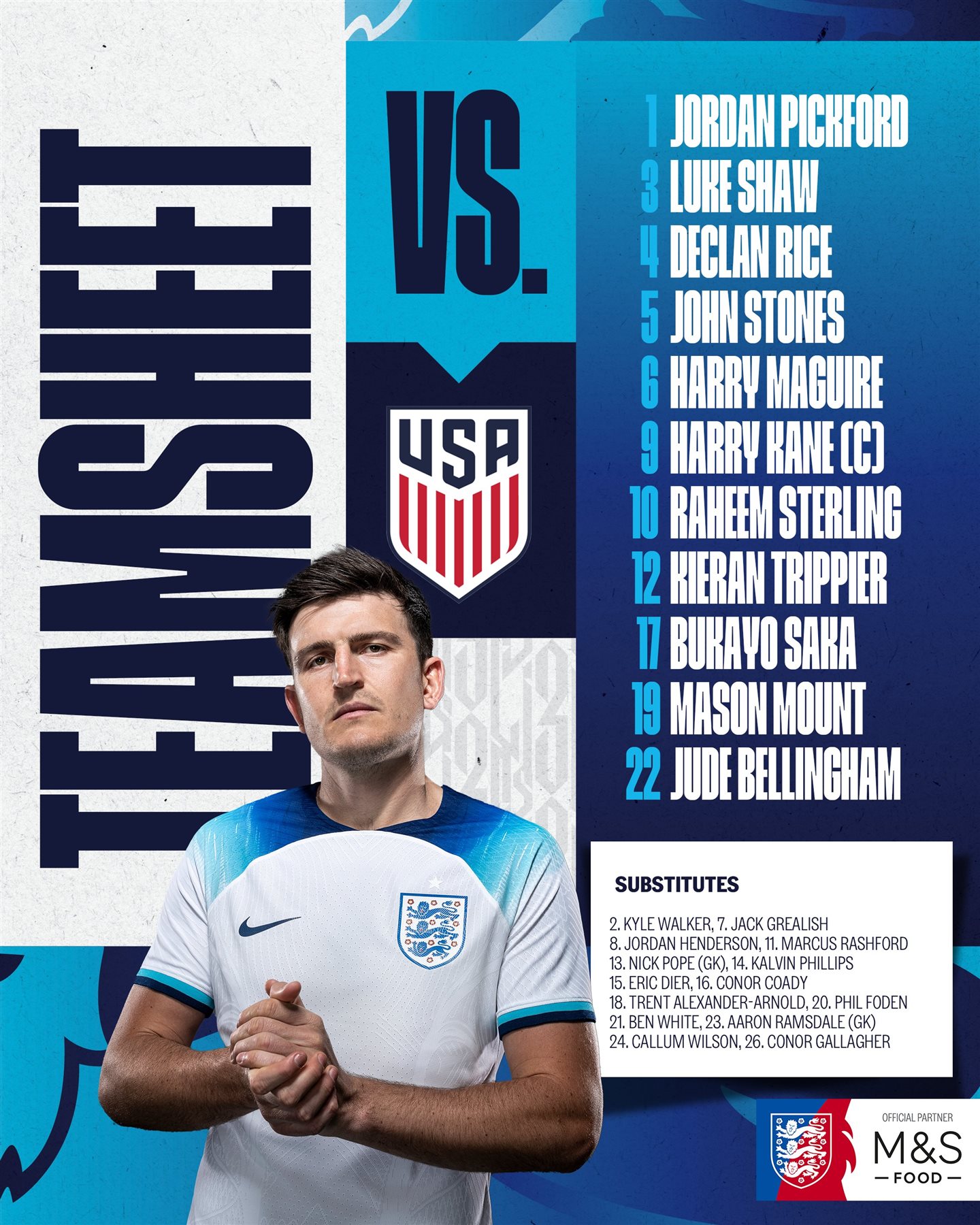 وأعلن جاريث ساوثجيت، المدير الفني لمنتخب إنجلترا، التشكيلة الأساسية للمنتخب الإنجليزي لخوض مباراته ضد الولايات المتحدة، والذي جاء كالتالي: