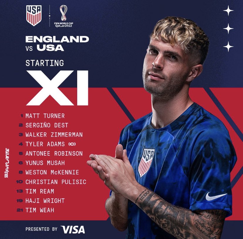 وفي المقابل، أعلن جريج برهالتر مدرب منتخب الولايات المتحدة الأمريكية عن التشكيل الرسمي للمنتخب الأمريكي، لمواجهة إنجلترا، وجاء كالتالي: