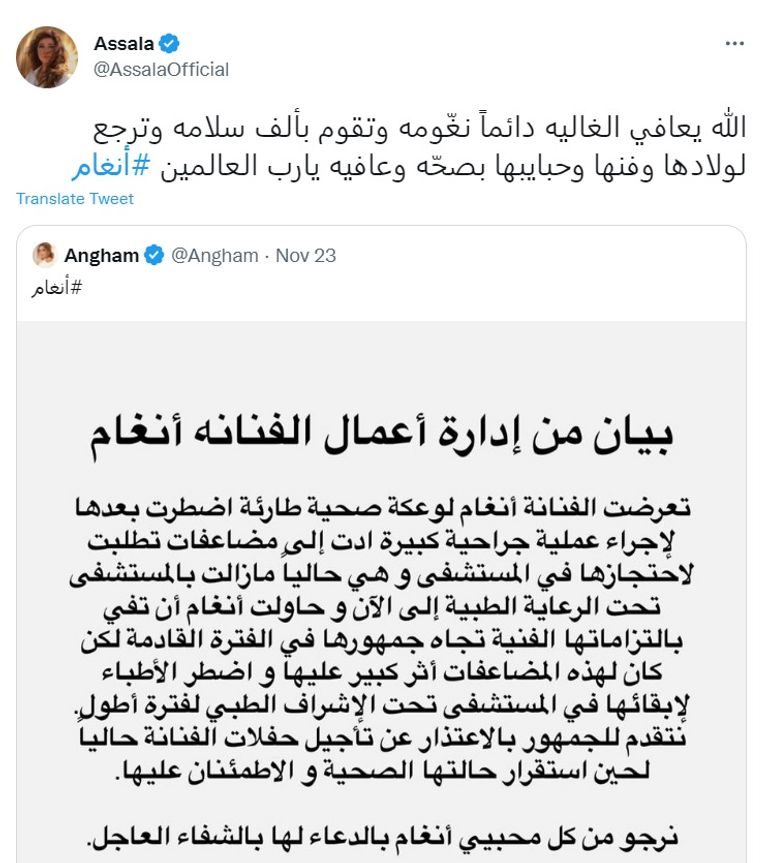 وقالت أصالة موجهة حديثها لأنغام: "الله يعافي الغالية دائمًا نغّومة، وتقوم بألف سلامة وترجع لأولادها وفنها وحبايبها بصحّة وعافية يا رب العالمين".