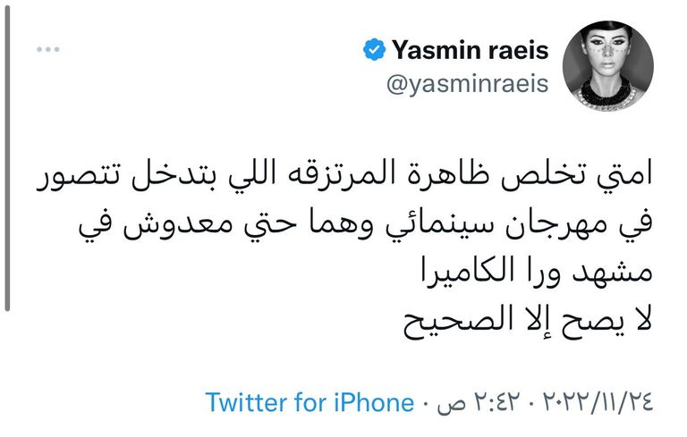 وغردت عبر صفحتها على توتير قائلة: "إمتى تخلص ظاهرة المرتزقة اللي بتدخل تتصور في مهرجان سينمائي، وهما حتى معدوش في مشهد ورا الكاميرا، لا يصح إلا الصحيح".