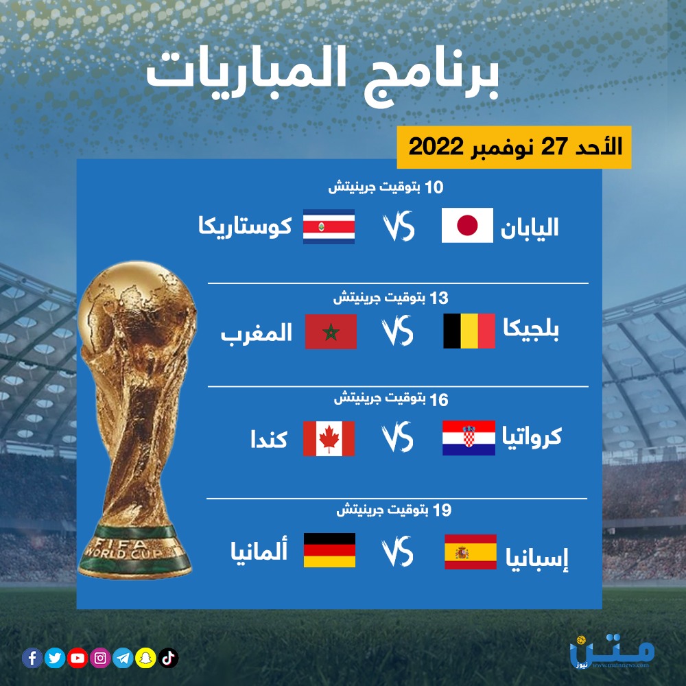 ومن المقرر أن تقام جميع مباريات اليوم الأحد 27-11-2022 في بطولة كأس العالم 2022 بقطر، في إطار مواجهات الجولة الثانية لدور المجموعات بالمونديال.