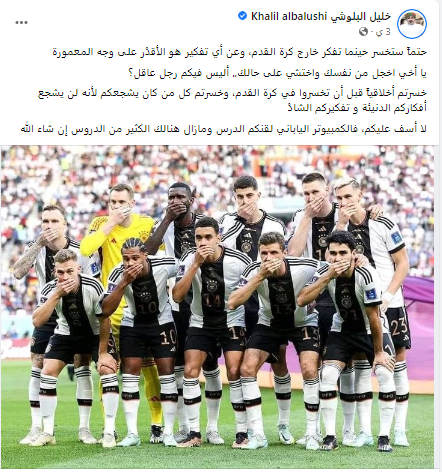 وهاجم المعلق العماني خليل البلوشي منتخب ألمانيا، عقب تلقي الماكينات الألمانية لخسارة قاسية من اليابان بعد إعلان دعمهم للشواذ والمثليين عبر شارة "تكميم الأفواه".