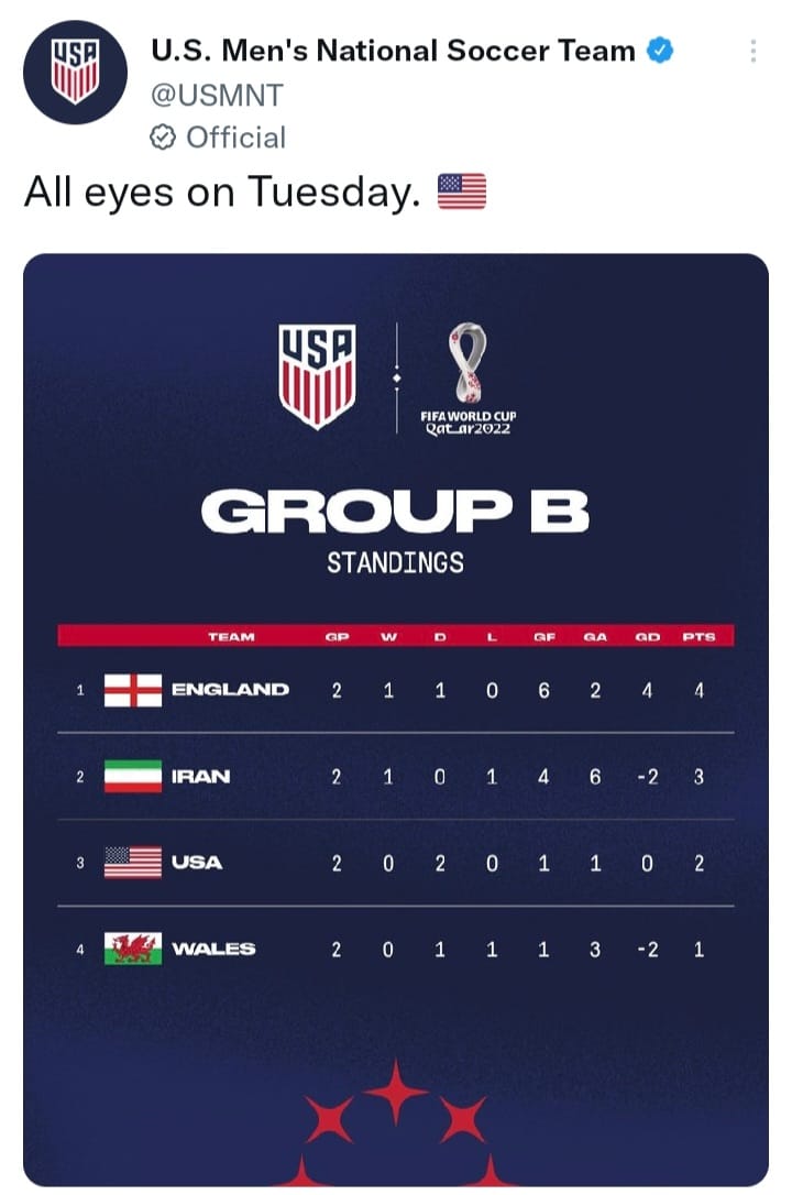 ونشر الحساب الرسمي لمنتخب أمريكا، ترتيب مجموعة الثانية في كأس العالم 2022، لكنه أزال الشعارات الدينية من علم منتخب إيران.