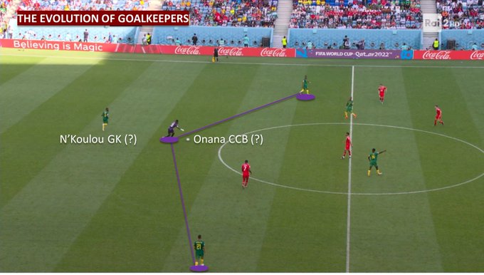 حاول أونانا في تلك اللقطات أن يلعب منتخب الكاميرون بثلاثي دفاعي يكون هو قاعدته من أجل إفساح المجال لزملائه وبالأخص الظهيرين للتقدم أكثر لمحاولة إدراك التعادل.