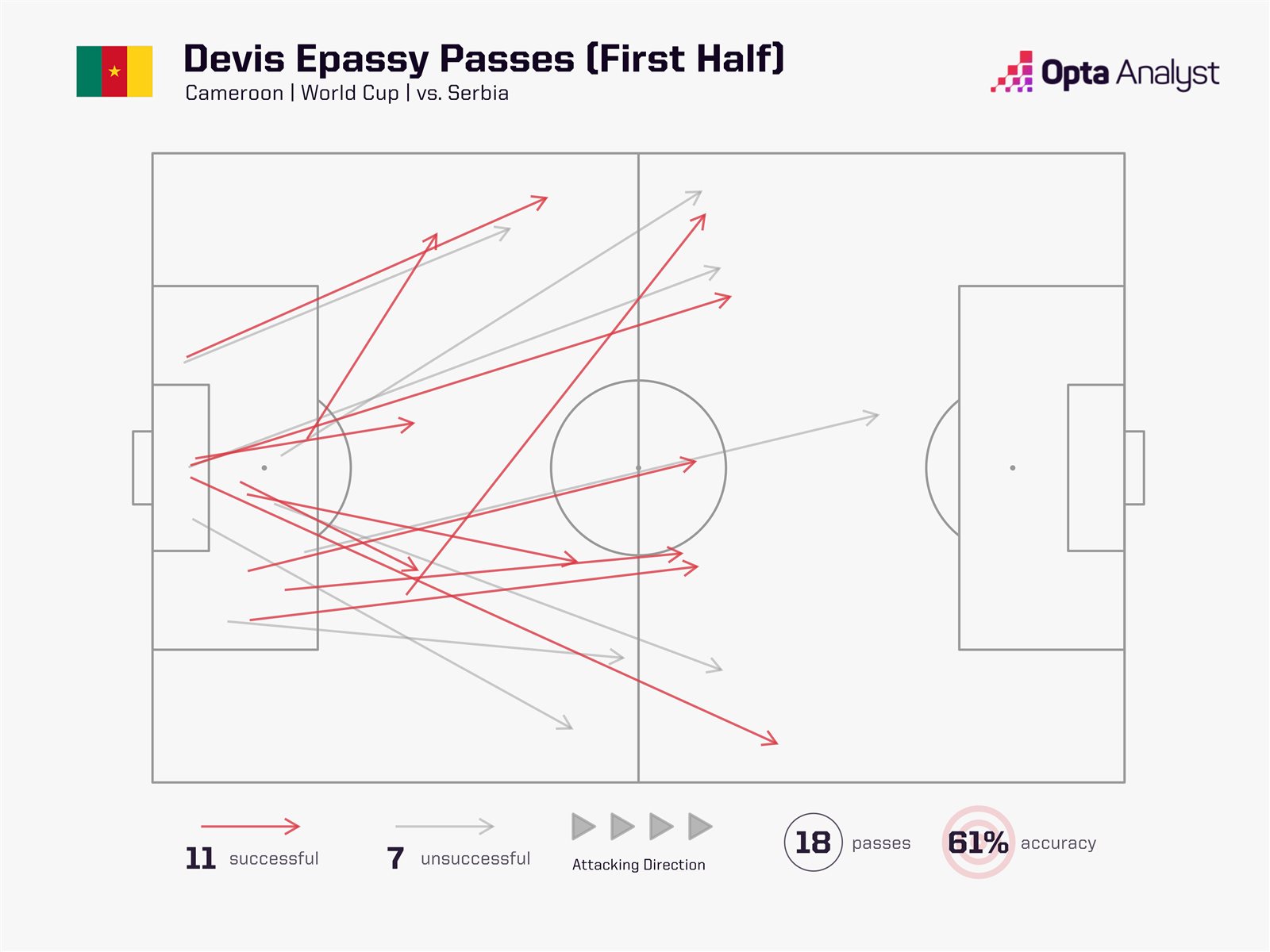 وعلى مستوى الكرات الطولية أرسل 11 صحيحة من أصل 26.