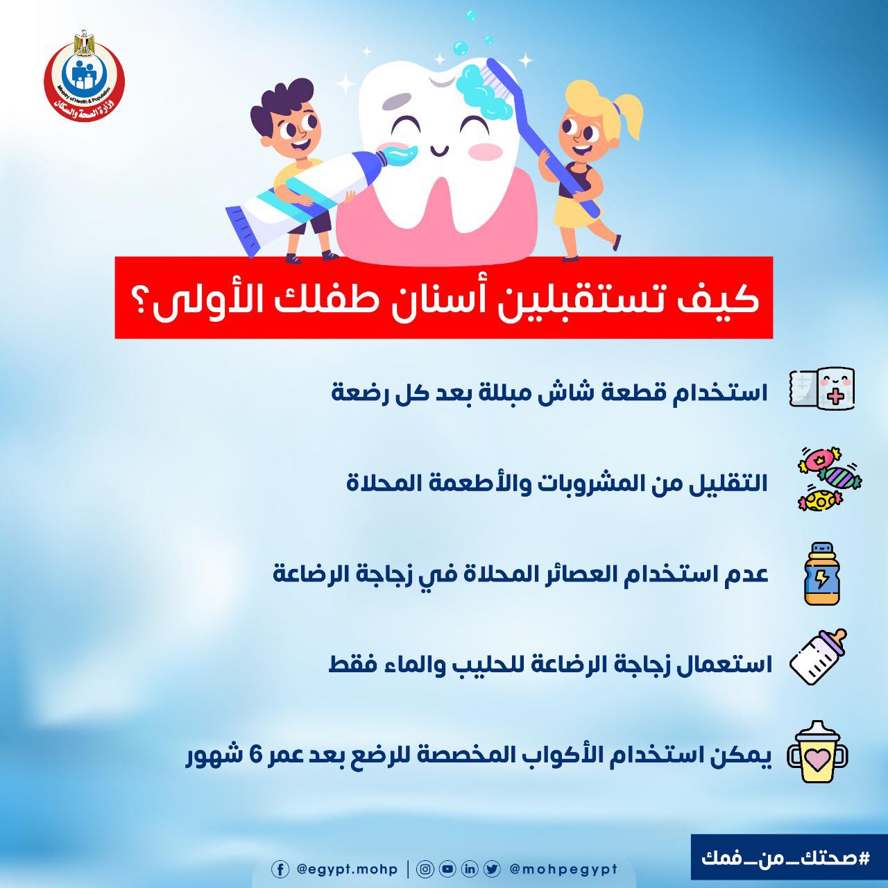 يقع على كاهل الأم العديد من المسؤوليات ومن ضمنها العناية بصحة فم وأسنان الطفل، ولذلك تتساءل كيف أنظف أسنان طفل عمر سنة؟ فمع بزوغ أول سن في فم الصغير سيكون من الضروري جدا معرفة سبل العناية بالأسنان الموصي بها طبيا، حيث أوضحت وزارة الصحة والسكان المصرية طريقة تنظيف أسنان الرضع بهذه الخطوات.