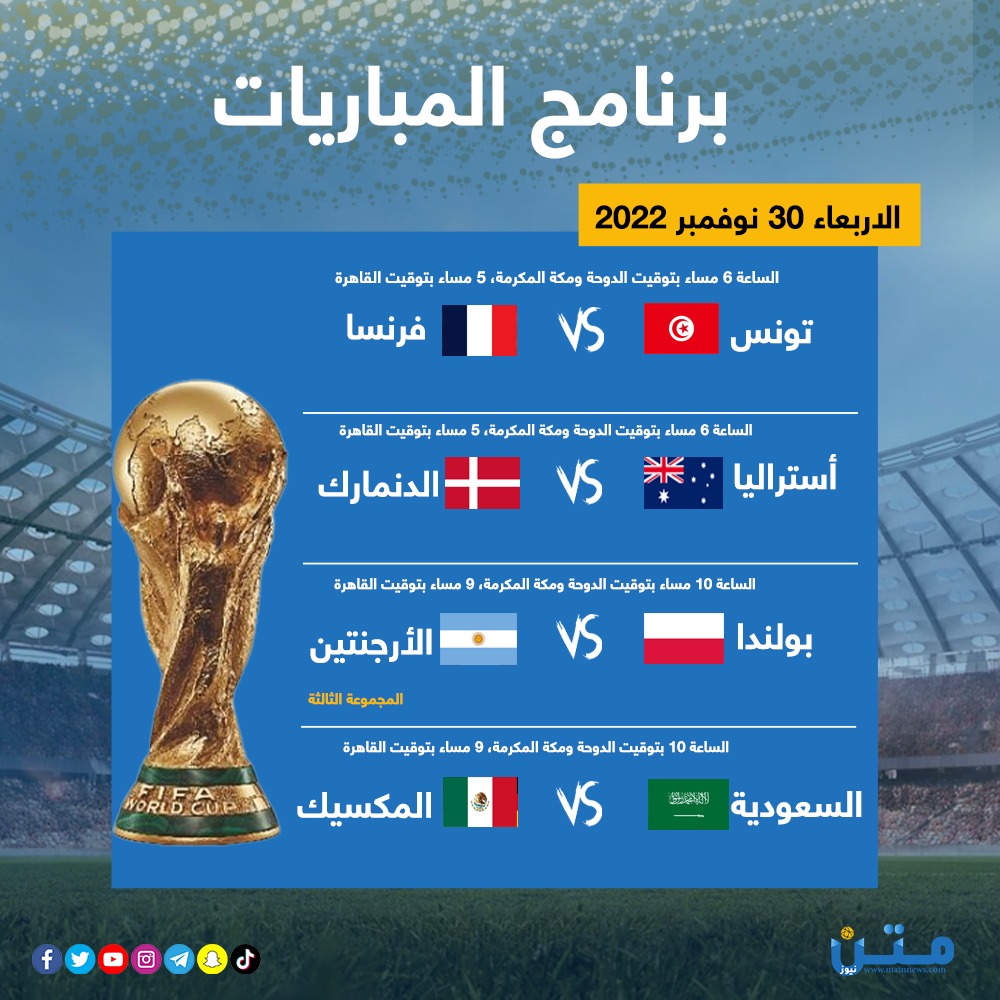 ويلتقي في مواجهات اليوم، منتخب السعودية مع المكسيك، وتونس مع فرنسا، وأيضا الأرجنتين وبولندا، وكذلك الدنمارك وأستراليا.