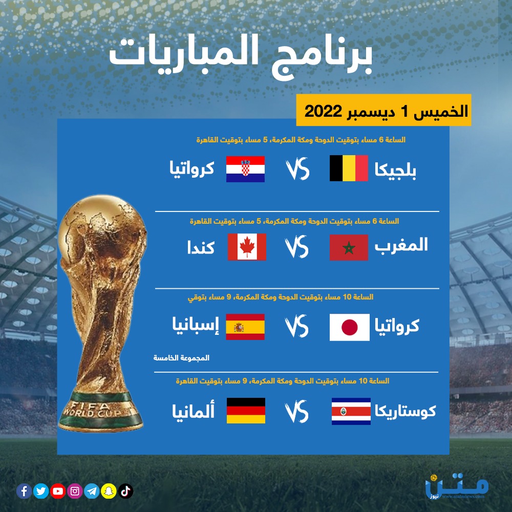تقام اليوم الخميس 1-12-2022، العديد من المواجهات القوية ضمن منافسات بطولة كأس العالم 2022 المقامة حاليا في قطر، وذلك ضمن منافسات الجولة الثالثة والأخيرة من دور المجموعات للمجموعتين الخامسة والسادسة.