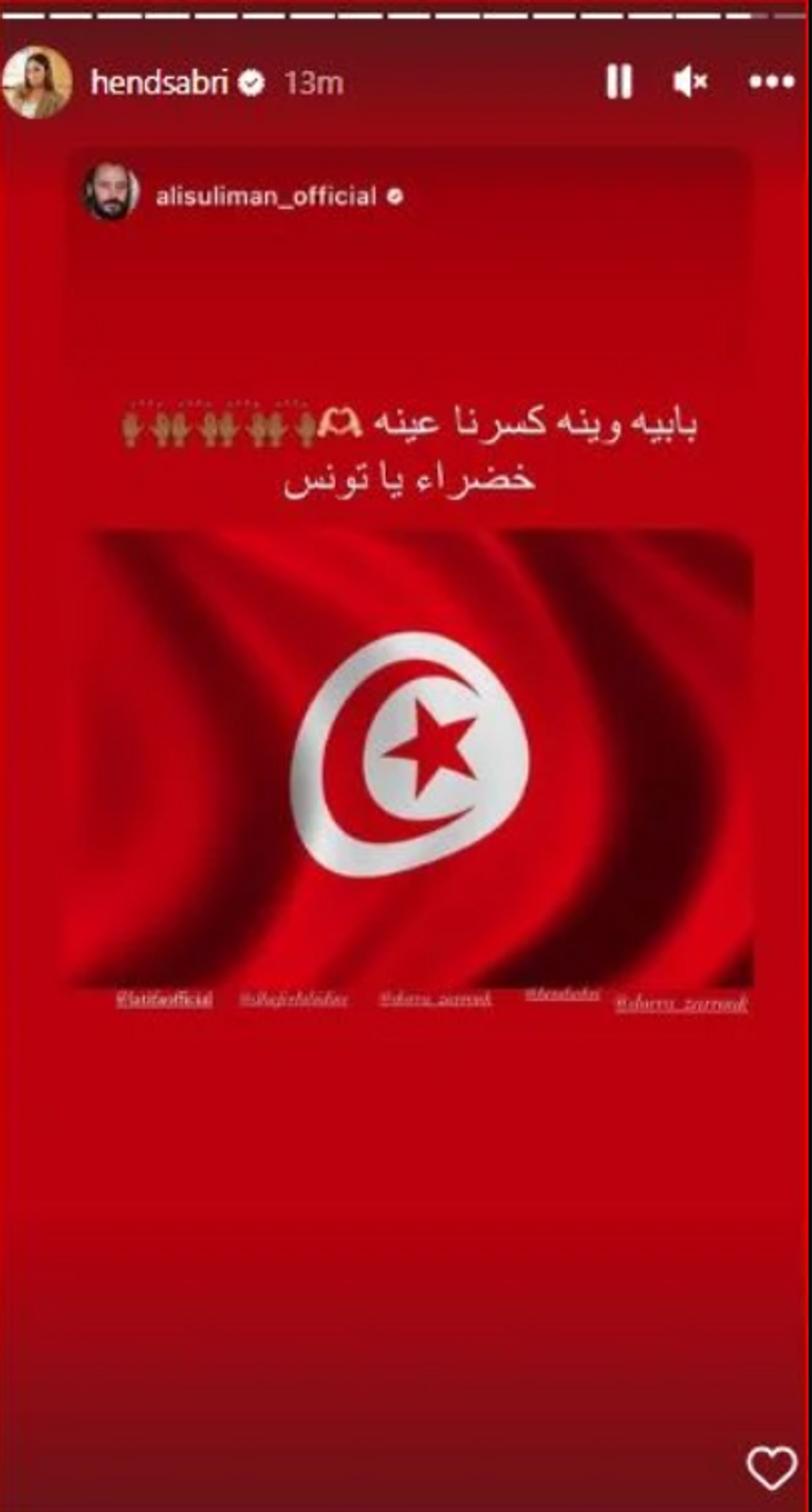 ونشرت هند صبري على "ستوري إنستجرام" صورة لعلم تونس مصحوبة بتعليق: "مبابي وينه كسرنا عينه.. خضراء يا تونس".