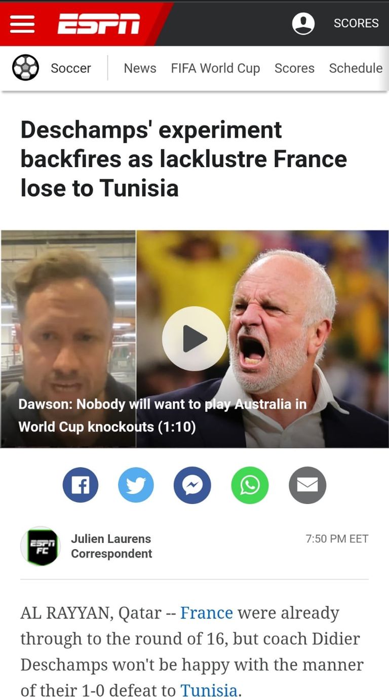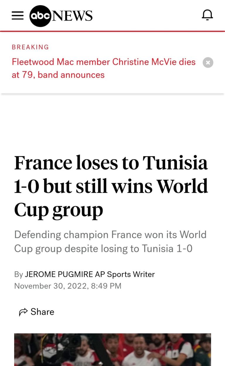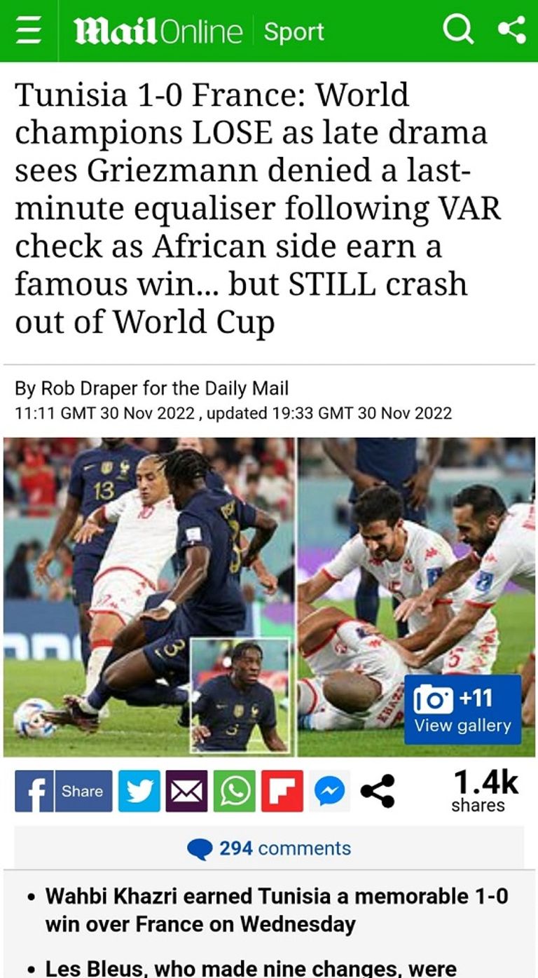 كما ركزت صحيفة "ديلي ميل" على هدف فرنسا الملغي في اللحظات الأخيرة من المباراة بسبب احتساب خطأ بعد العودة لتقنية الـ VAR، متابعة: "تونس تظفر بانتصار عظيم، لكنها خارج البطولة".