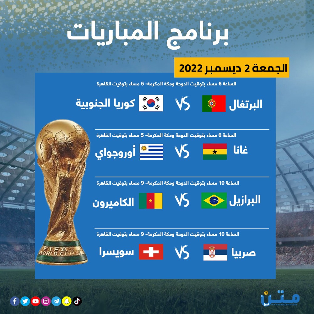 البرتغال x كوريا الجنوبية - الساعة 6 مساء بتوقيت الدوحة ومكة المكرمة- 5 مساء بتوقيت القاهرة.