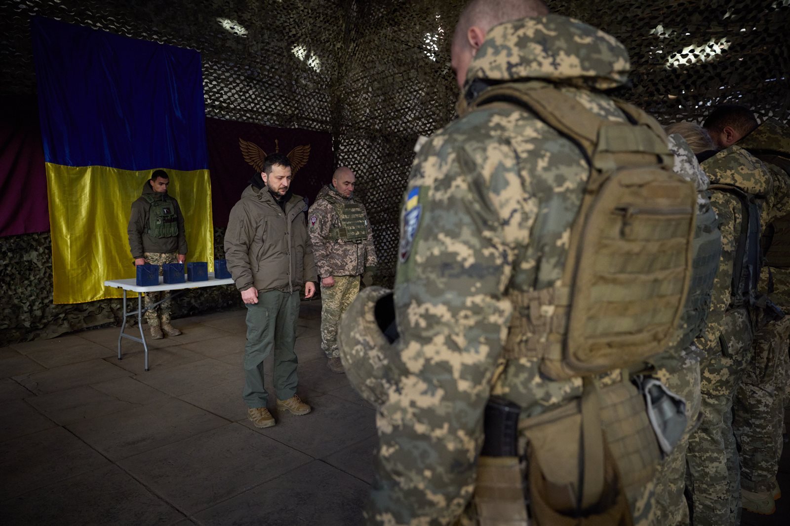 وخلال زيارته بالقرب من الجبهة، وهي واحدة من عدة زيارات قام بها في الأشهر القليلة الماضية، كرم زيلينسكي عددا من الجنود وقلدهم أوسمة.