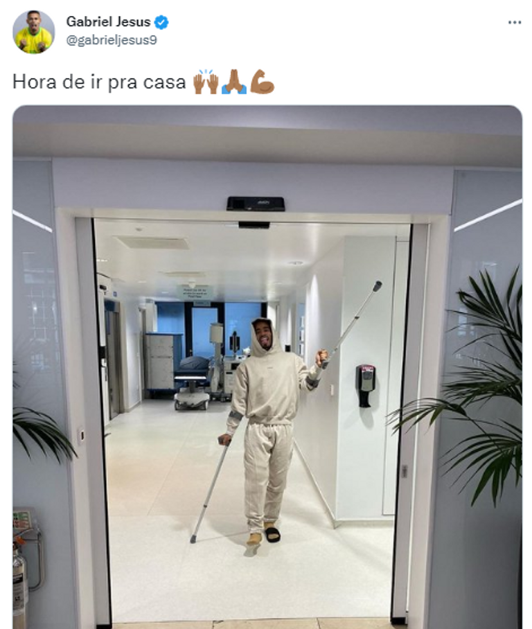 وقرر جيسوس تجاوز أحزانه سريعًا وقضاء وقت ممتع مع عائلته بعد اجتياز العملية الجراحية، حيث نشر النجم البرازيلي صورة على حسابه الشخصي على "تويتر" وهو يضحك ويمزح حاملًا عكازيه الطبيين، معلقا عليها: "إنه وقت العودة للمنزل!".