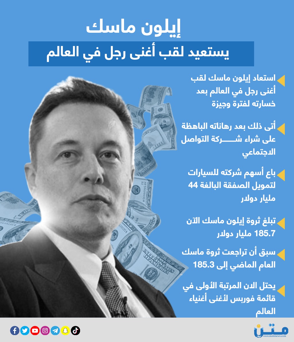 - استعاد إيلون ماسك لقب أغنى رجل في العالم بعد خسارته لفترة وجيزة