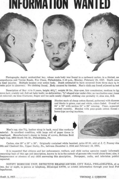 وفي 25 فبراير 1957، عُثر على جثة الطفل مع كدمات عدة عليها، وكانت ملفوفة ببطانية وموضوعة داخل علبة في منطقة حرجية من المدينة الواقعة شمال شرق الولايات المتحدة.