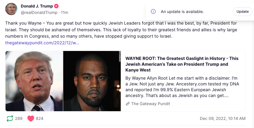 يأتي البيان بعد أقل من ثلاثة أسابيع من عشاء أقامه ترامب مع نيك فوينتيس، الذي يشكك في الهولوكوست ويصنف من قبل رابطة مكافحة التشهير بأنه متعصب للبيض، وكاني ويست، مغني الراب الذي يذهب الآن إلى يي والذي روج منذ شهور. تيار مستمر من الإهانة اللا سامية.