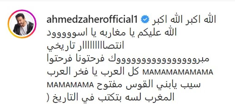 نشر الفنان أحمد زاهر، عبر حسابه على موقع "إنستجرام"، صورة للاعبي منتخب المغرب، وعلق عليها: "الله أكبر.. الله أكبر.. الله عليكم يا مغاربة يا أسود.. انتصار تاريخي مبروك.. فرحتونا فرحتوا كل العرب يا فخر العرب.. سيب يابني القوس مفتوح.. المغرب لسه بتكتب في التاريخ".