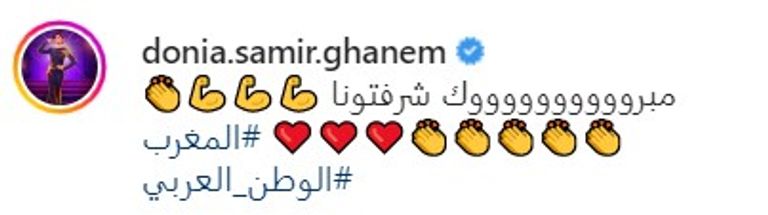 حيث نشرت الفنانة المصرية دنيا سمير غانم، عبر حسابها موقع "إنستجرام"، صورة للعلم المغربي، وعلقت عليه: "مبروك شرفتونا".
