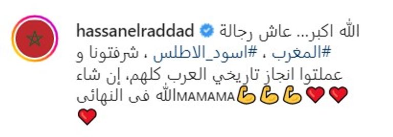 كما حرص الفنان حسن الرداد على تهنئة أسود الأطلس، قائلا: "الله أكبر عاش رجالة المغرب، أسود الأطلس، شرفتونا وعملتوا إنجاز تاريخي للعرب كلهم، إن شاء الله في النهائي".