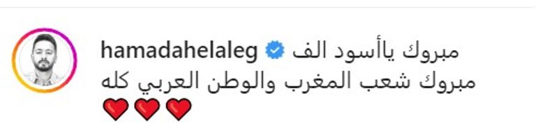 وعبر حسابه على موقع "إنستجرام"، هنأ الفنان حماده هلال الشعب المغربي والوطن العربي بالفوز، قائلا: "مبروك يا أسود.. ألف مبروك شعب المغرب، والوطن العربي كله".